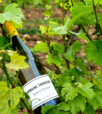 サン・ヴェランに使用されるシャルドネは、イタリア系移民の子孫ジェローム・イノソンティが2011年に継承したドメーヌの11.5haの畑のうち約5haの厳選された区画で栽培されています。生態系のバランスを維持するため、サステナブル農法を実践し、年に数回畑を軽く耕して土壌に空気を入れ、厳しい収量制限を行っています。収穫はブドウがよく熟すまで待ち、出来るだけ遅めの収穫を行います。ワイン造りは、天然酵母で長い時間をかけて自然発酵させ、SO2(酸化防止剤)の使用も必要最小限に抑えています。